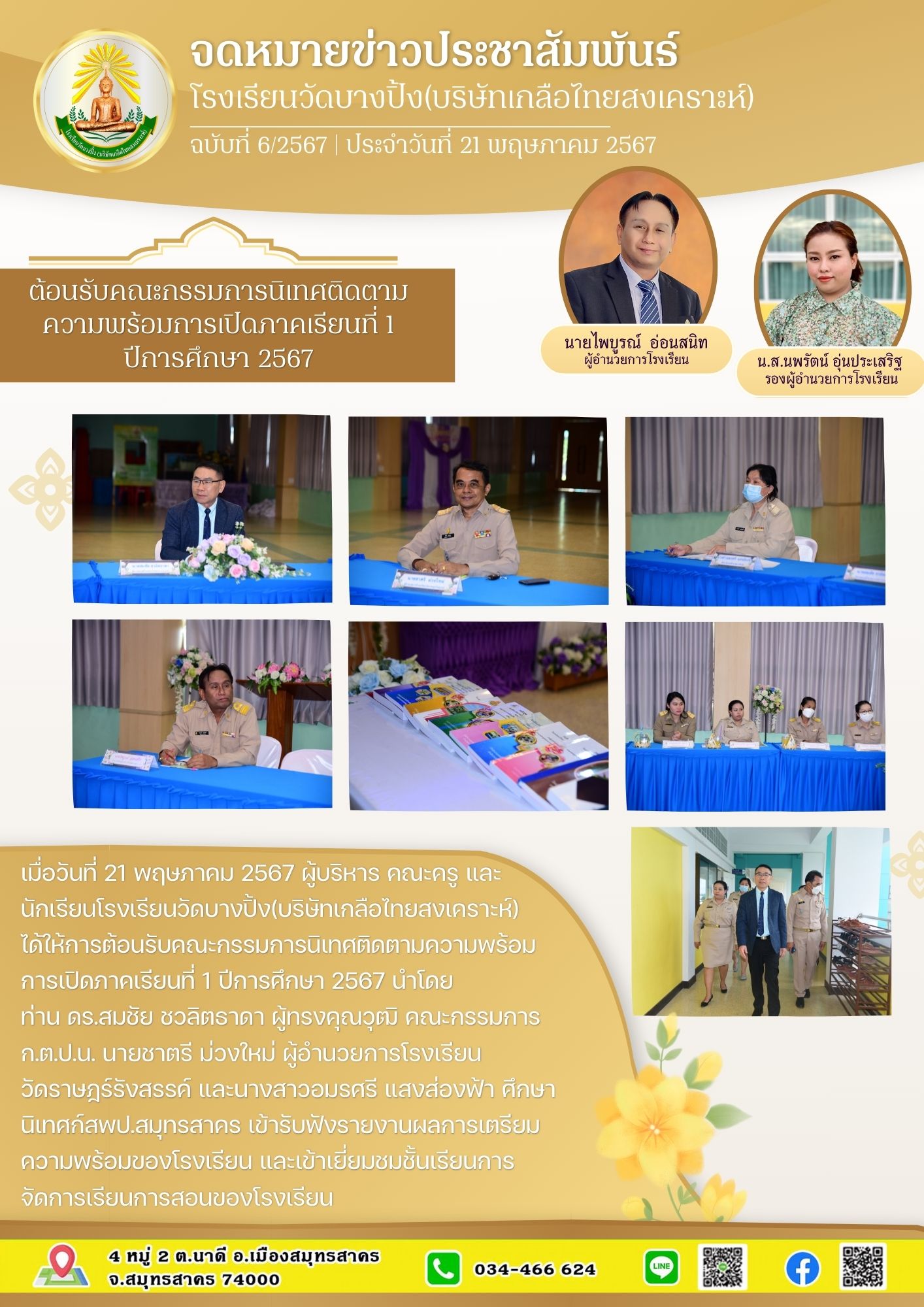 จดหมายข่าวฉบับที่ 6/2567 วันที่ 21 พฤษภาคม 2567 ผู้บริหาร คณะครู และนักเรียนโรงเรียนวัดบางปิ้ง(บริษัทเกลือไทยสงเคราะห์) ได้รับการนิเทศติดตามความพร้อมการเปิดภาคเรียนที่ 1 ปีการศึกษา 2567 โดย ท่าน ดร.สมชัย ชวลิตธาดา ผู้ทรงคุณวุฒิ คณะกรรมการ ก.ต.ป.น. นายชาตรี ม่วงใหม่ ผู้อำนวยการโรงเรียนวัดราษฎร์รังสรรค์ และนางสาวอมรศรี แสงส่องฟ้า ศึกษานิเทศก์ สพป.สมุทรสาคร รายงานผลการเตรียมความพร้อมของโรงเรียน และเยี่ยมชมชั้นเรียนการจัดการเรียนการสอนของโรงเรียนวัดบางปิ้ง(บริษัทเกลือไทยสงเคราะห์)