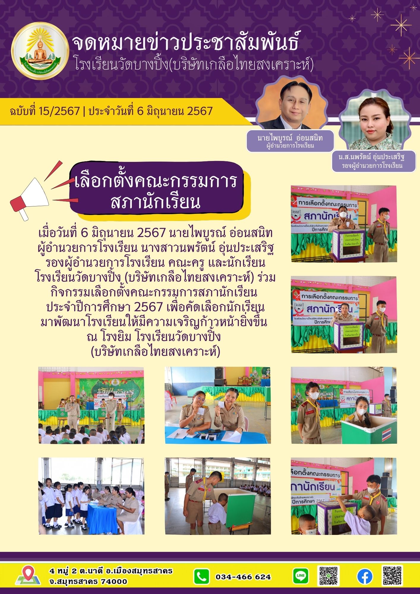 จดหมายข่าวฉบับที่ 15/2567 วันที่ 6 มิถุนายน 2567 นายไพบูรณ์ อ่อนสนิท ผู้อำนวยการโรงเรียน นางสาวนพรัตน์ อุ่นประเสริฐ รองผู้อำนวยการโรงเรียน คณะครู และนักเรียนโรงเรียนวัดบางปิ้ง (บริษัทเกลือไทยสงเคราะห์) ร่วมกิจกรรมเลือกตั้งคณะกรรมการสภานักเรียน ประจำปีการศึกษา 2567 เพื่อคัดเลือกนักเรียนมาพัฒนาโรงเรียนให้มีความเจริญก้าวหน้ายิ่งขึ้น ณ โรงยิม โรงเรียนวัดบางปิ้ง (บริษัทเกลือไทยสงเคราะห์)