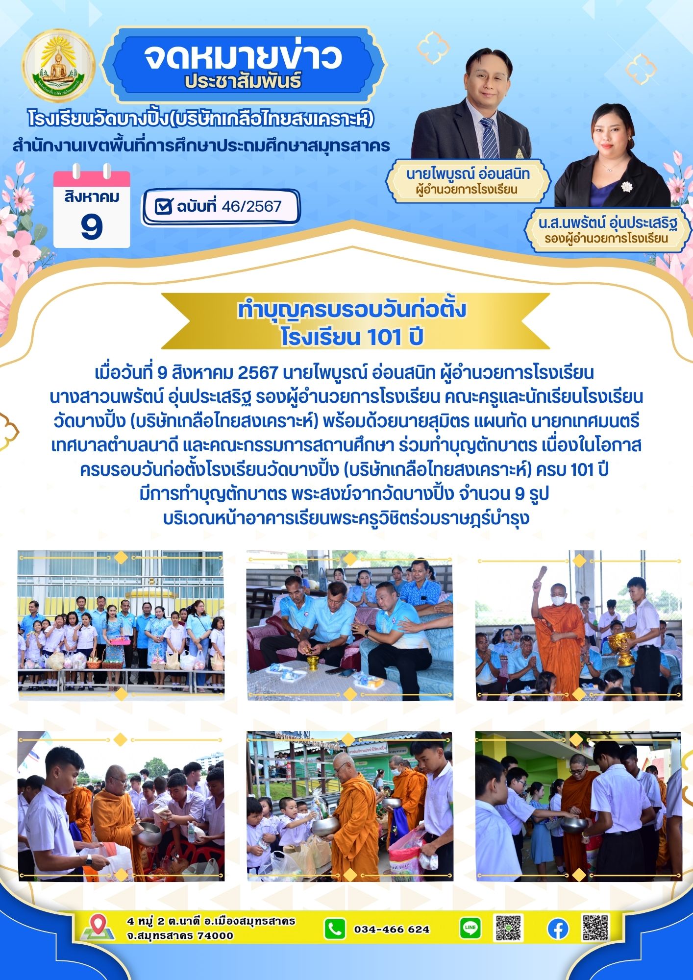 จดหมายข่าวฉบับที่ 46/2567 วันที่ 9 สิงหาคม 2567 นายไพบูรณ์ อ่อนสนิท ผู้อำนวยการโรงเรียน นางสาวนพรัตน์ อุ่นประเสริฐ รองผู้อำนวยการโรงเรียน คณะครูและนักเรียนโรงเรียนวัดบางปิ้ง (บริษัทเกลือไทยสงเคราะห์) พร้อมด้วยนายสุมิตร แผนทัด นายกเทศมนตรีเทศบาลตำบลนาดี และคณะกรรมการสถานศึกษา ร่วมทำบุญตักบาตร เนื่องในโอกาสครบรอบวันก่อตั้งโรงเรียนวัดบางปิ้ง (บริษัทเกลือไทยสงเคราะห์) ครบ 101 ปี มีการทำบุญตักบาตร พระสงฆ์จากวัดบางปิ้ง จำนวน 9 รูป บริเวณหน้าอาคารเรียนพระครูวิชิตร่วมราษฎร์บำรุง