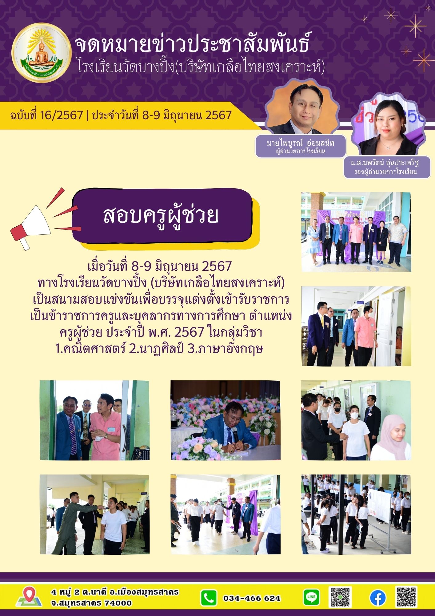 จดหมายข่าวฉบับที่ 16/2567 วันที่ 8-9 มิถุนายน 2567 ทางโรงเรียนวัดบางปิ้ง (บริษัทเกลือไทยสงเคราะห์) เป็นสนามสอบแข่งขันเพื่อบรรจุแต่งตั้งเข้ารับราชการเป็นข้าราชการครูและบุคลากรทางการศึกษา ตำแหน่งครูผู้ช่วย ประจำปี พ.ศ. 2567 ในกลุ่มวิชา คณิตศาสตร์ นาฏศิลป์ และภาษาอังกฤษ