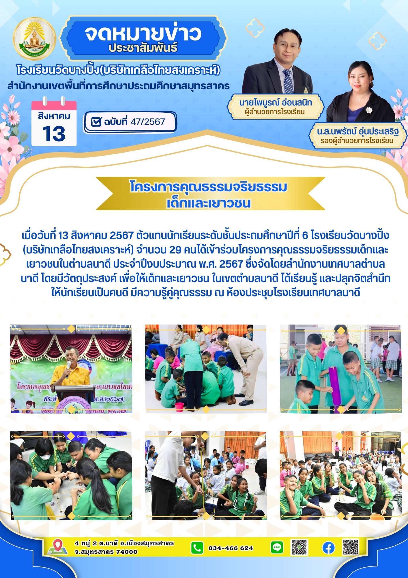 จดหมายข่าวฉบับที่ 47/2567 วันที่ 13 สิงหาคม 2567 ตัวแทนนักเรียนระดับชั้นประถมศึกษาปีที่ 6 โรงเรียนวัดบางปิ้ง (บริษัทเกลือไทยสงเคราะห์) จำนวน 29 คนได้เข้าร่วมโครงการคุณธรรมจริยธรรมเด็กและเยาวชนในตำบลนาดี ประจำปีงบประมาณ พ.ศ. 2567 ซึ่งจัดโดยสำนักงานเทศบาลตำบลนาดี โดยมีวัตถุประสงค์ เพื่อให้เด็กและเยาวชน ในเขตตำบลนาดี ได้เรียนรู้ และปลุกจิตสำนึกให้นักเรียนเป็นคนดี มีความรู้คู่คุณธรรม ณ ห้องประชุมโรงเรียนเทศบาลนาดี