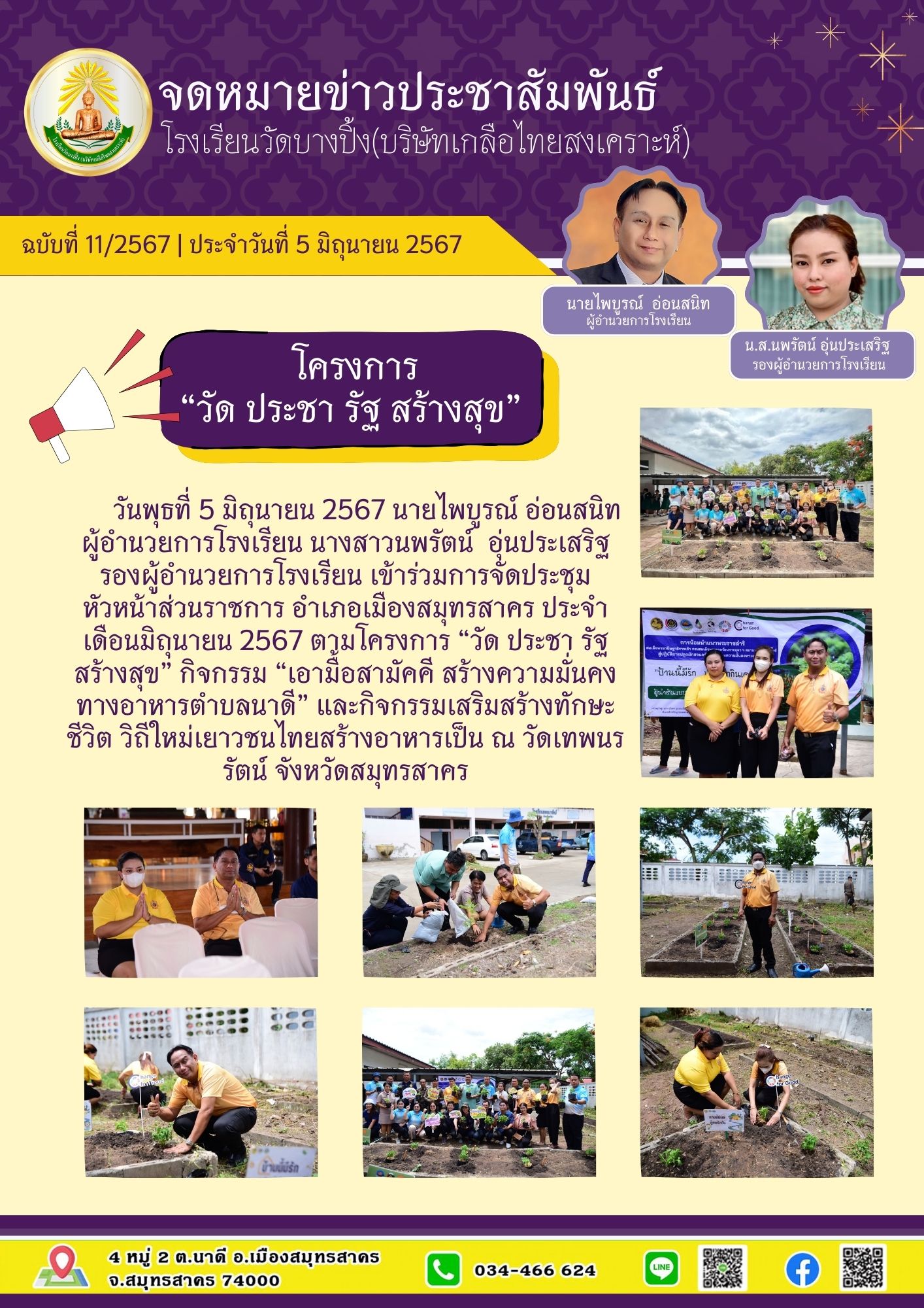 จดหมายข่าวฉบับที่ 11/2567 วันที่ 5 มิถุนายน 2567 นายไพบูรณ์ อ่อนสนิท ผู้อำนวยการโรงเรียน และนางสาวนพรัตน์ อุ่นประเสริฐ รองผู้อำนวยการโรงเรียน เข้าร่วมการจัดประชุมหัวหน้าส่วนราชการ อำเภอเมืองสมุทรสาคร ประจำเดือนมิถุนายน 2567 ตามโครงการ “วัด ประชารัฐ สร้างสุข” กิจกรรม “เอามื้อสามัคคี สร้างความมั่นคงทางอาหารตำบลนาดี” และกิจกรรมเสริมสร้างทักษะชีวิต วิถีใหม่เยาวชนไทยสร้างอาหารเป็น ณ วัดเทพนรรัตน์ จังหวัดสมุทรสาคร
